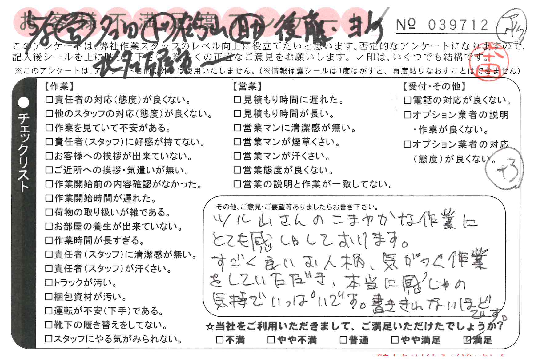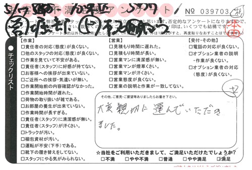 引越一番でお引越しをしていただいたお客様のうち、コメントいただいたアンケートを全て掲載しています。