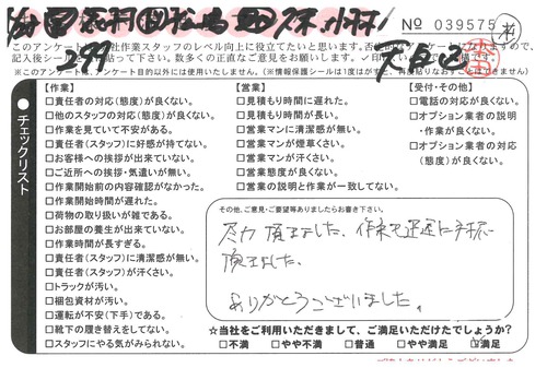 4/27 引越 営業:天野 ドライバー:本名 スタッフ:佐々木・松井* 作業時間は確かに遅れたが、ハキハキやってくれた。