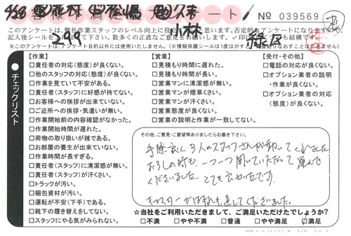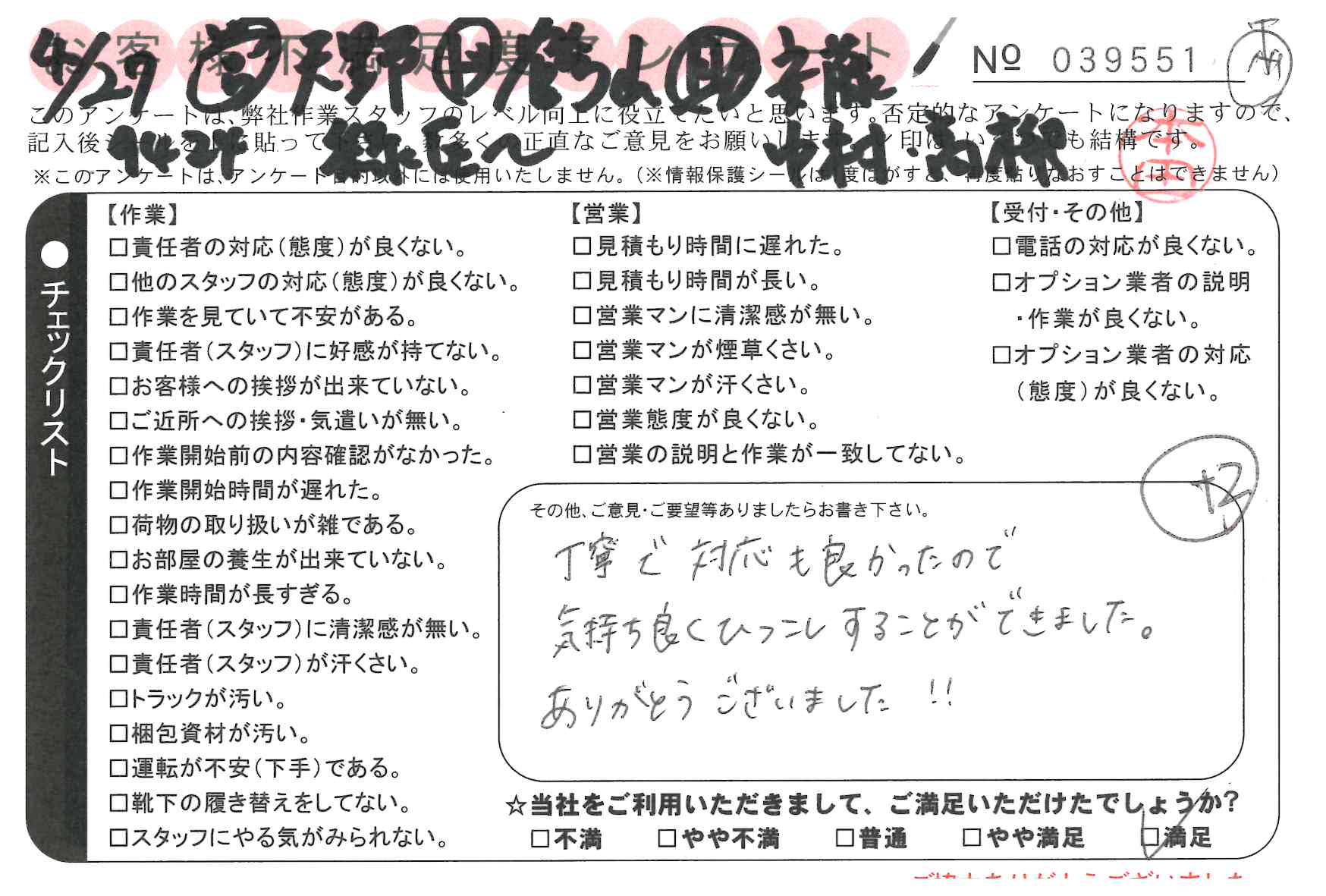 4/28 引越 営業:天野 ドライバー:松嶋 スタッフ:久末・小林* とても丁寧な対応で満足しました。