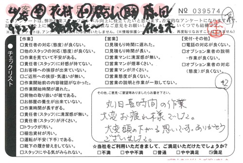 引越一番でお引越しをしていただいたお客様のうち、コメントいただいたアンケートを全て掲載しています。
