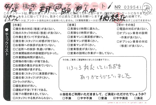 引越一番でお引越しをしていただいたお客様のうち、コメントいただいたアンケートを全て掲載しています。
