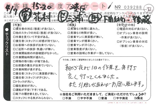 4/7 引越 営業:本名 ドライバー:安藤 スタッフ:杉浦* 対応もよく、次回、機会があれば、また