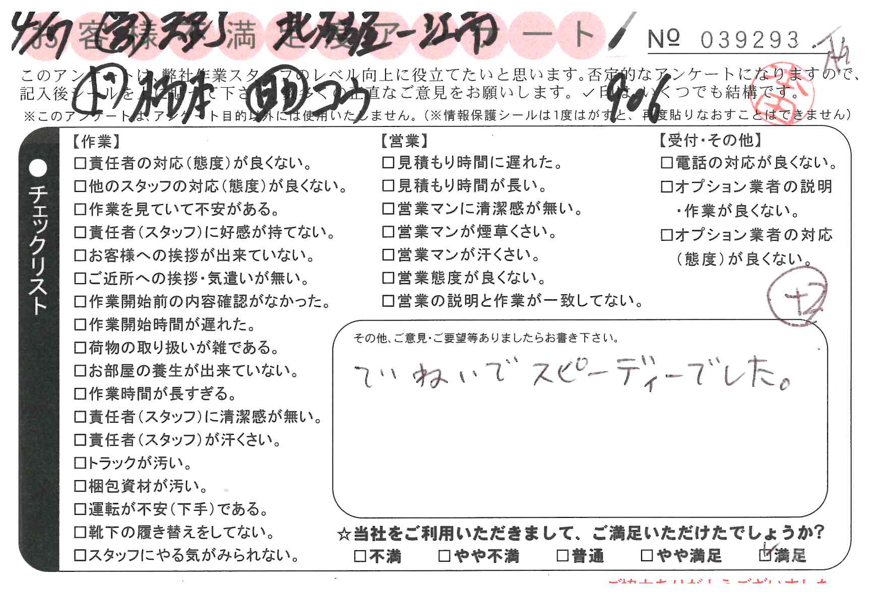 4/6 引越 営業:青木 ドライバー:三浦 スタッフ:下畝地・張* すばやく作業して頂けて助かりました。