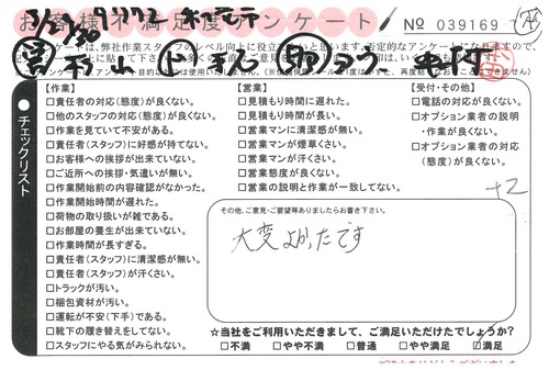 引越一番でお引越しをしていただいたお客様のうち、コメントいただいたアンケートを全て掲載しています。