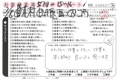 3/16 引越 営業:天野 ドライバー:藤田・西 スタッフ:高・安藤* 不満はありません。ありがとうございました。