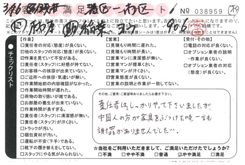 3/16 引越 営業:浅井 ドライバー:楠本 スタッフ:稲葉・楊* 責任者はしっかりやって下さいましたが、中国人の方