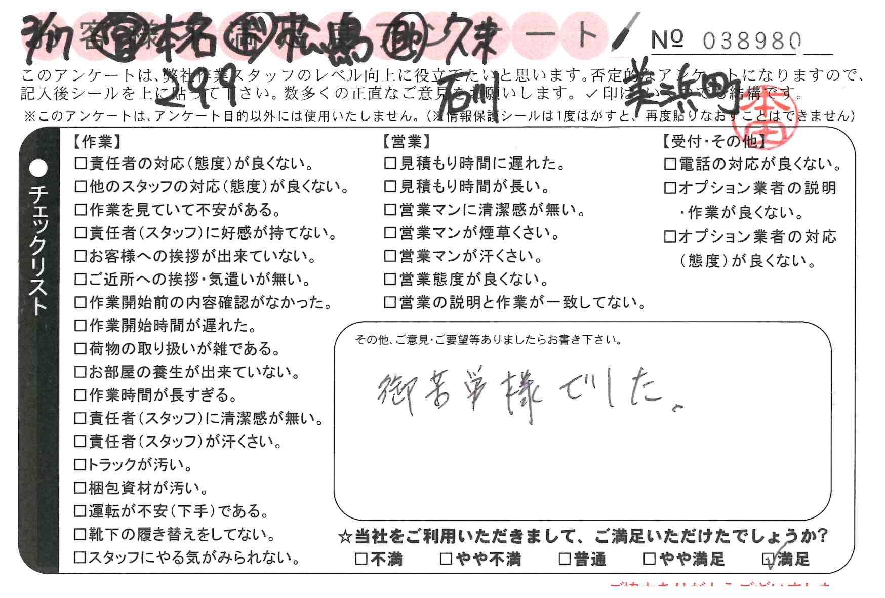 引越一番でお引越しをしていただいたお客様のうち、コメントいただいたアンケートを全て掲載しています。
