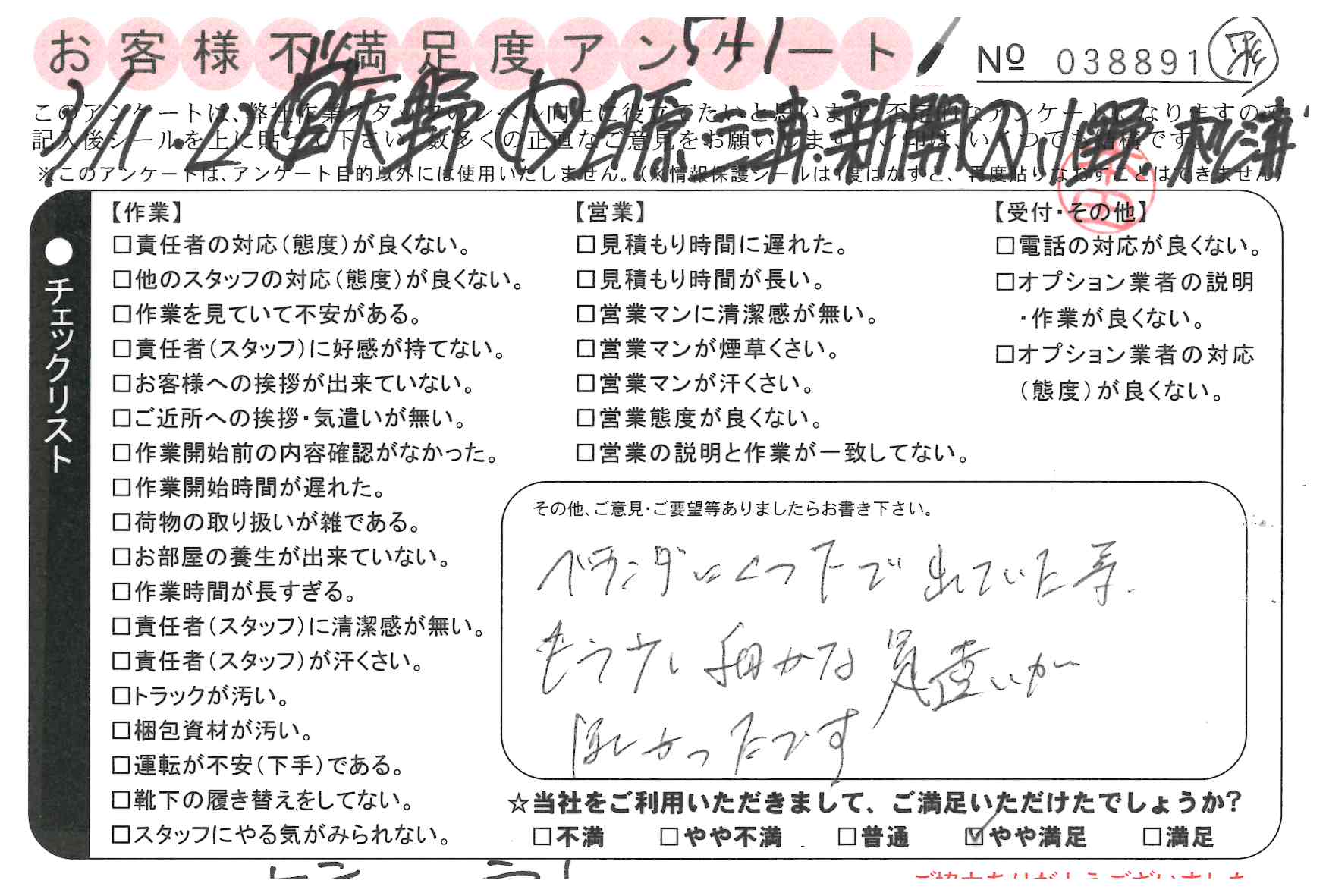 3/11 引越 営業:天野 ドライバー:日原・三浦・新開 スタッフ:小野・杉浦* ベランダにくつ下で出ていた等もう少し細かな気遣いが