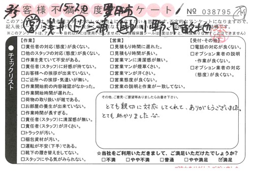 引越一番でお引越しをしていただいたお客様のうち、コメントいただいたアンケートを全て掲載しています。