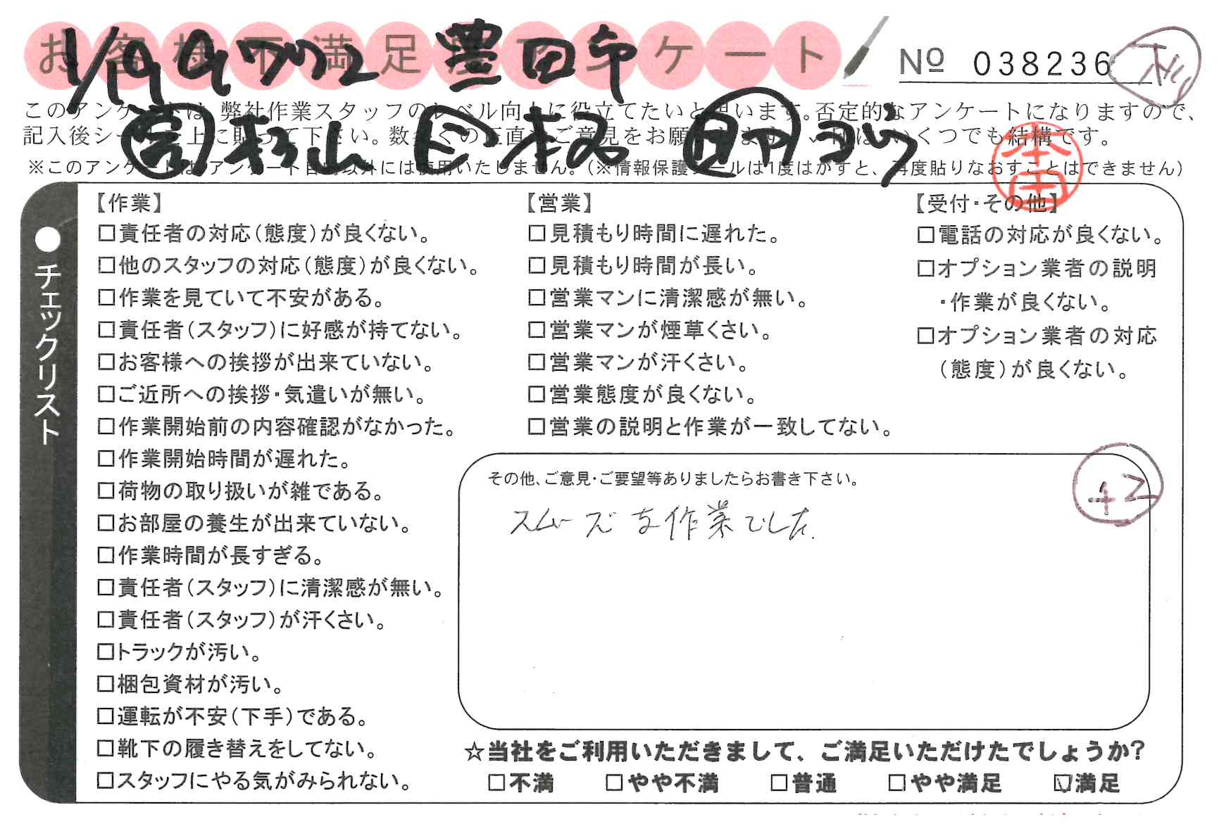 1/20 引越 営業:名田 ドライバー:日原 スタッフ:楊* とても助かりました。ありがとうございました。