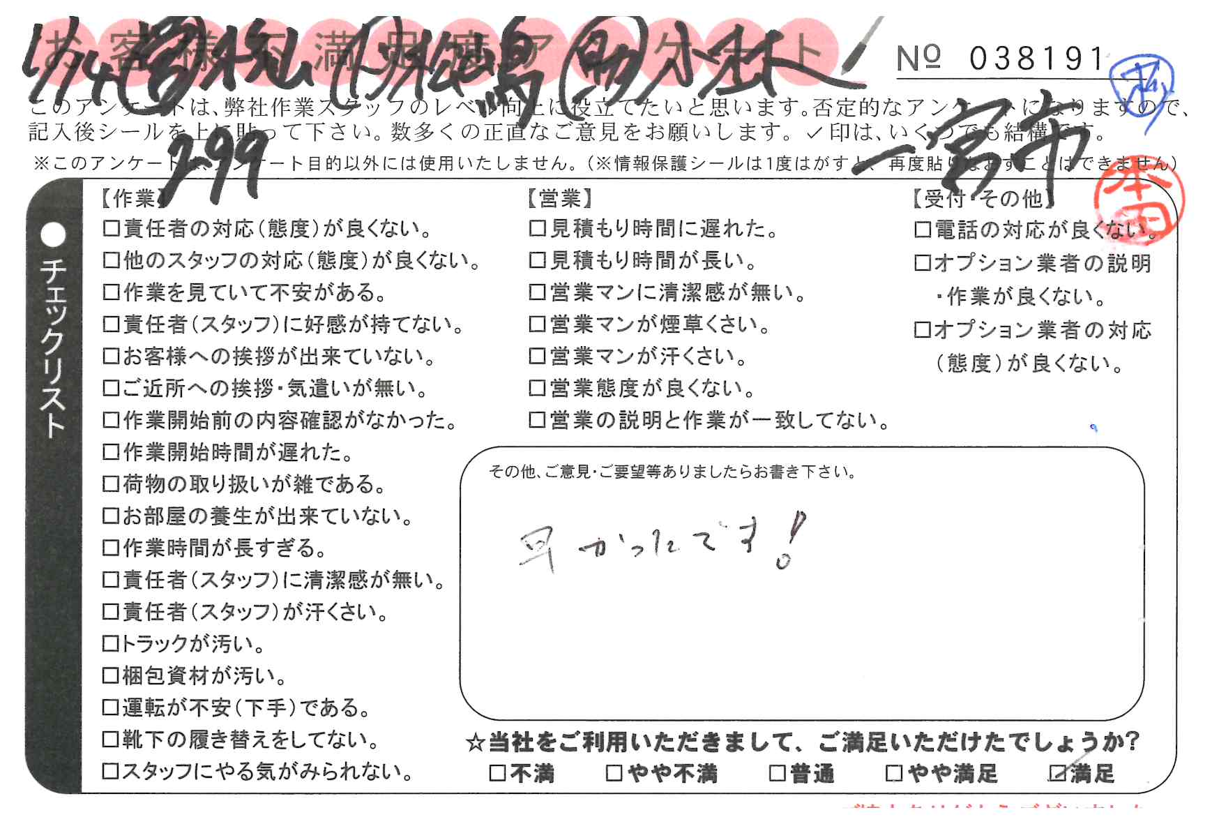 引越一番でお引越しをしていただいたお客様のうち、コメントいただいたアンケートを全て掲載しています。