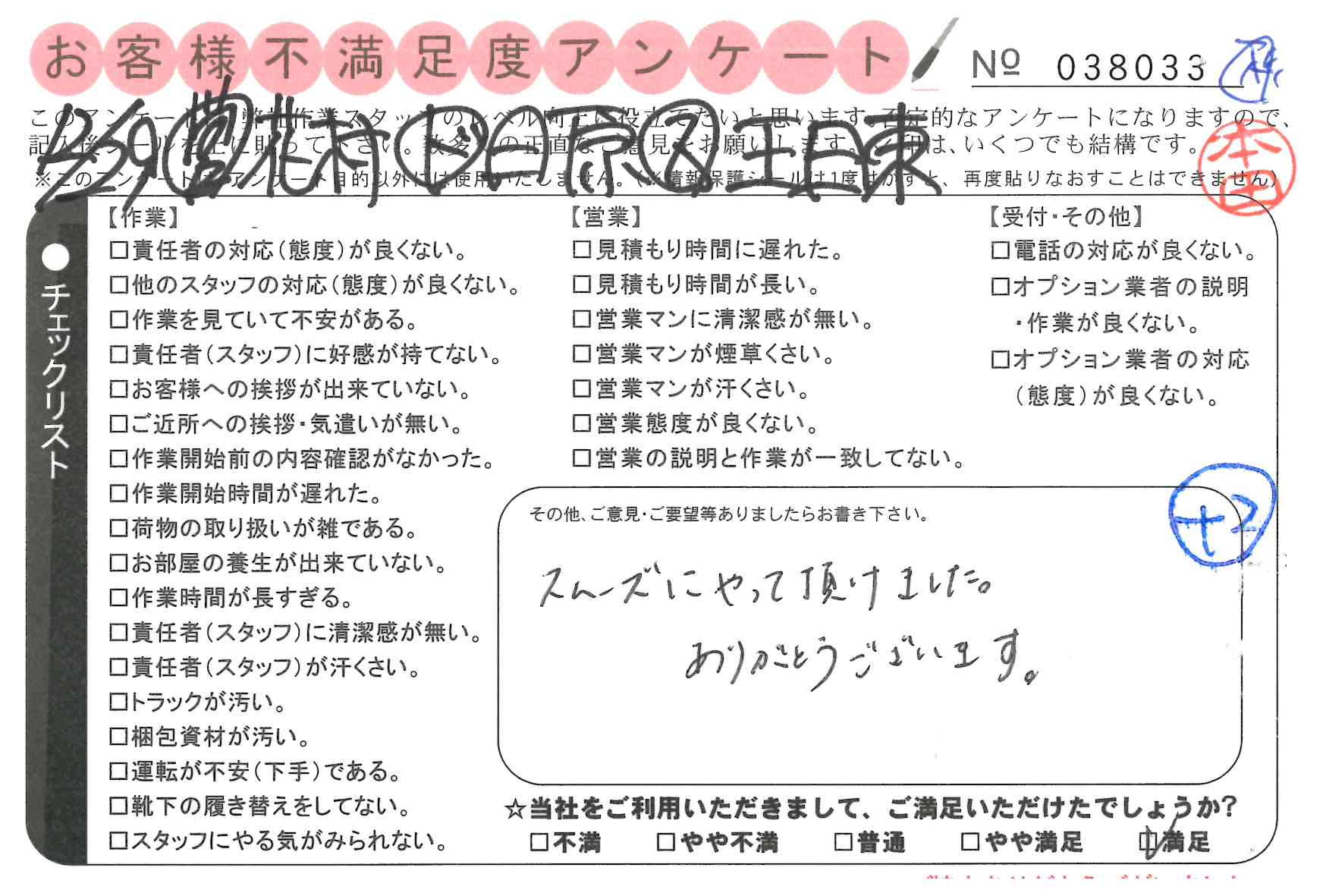 12/29 引越 営業:花村 ドライバー:日原 スタッフ:オウ* スムーズにやって頂けました。ありがとう