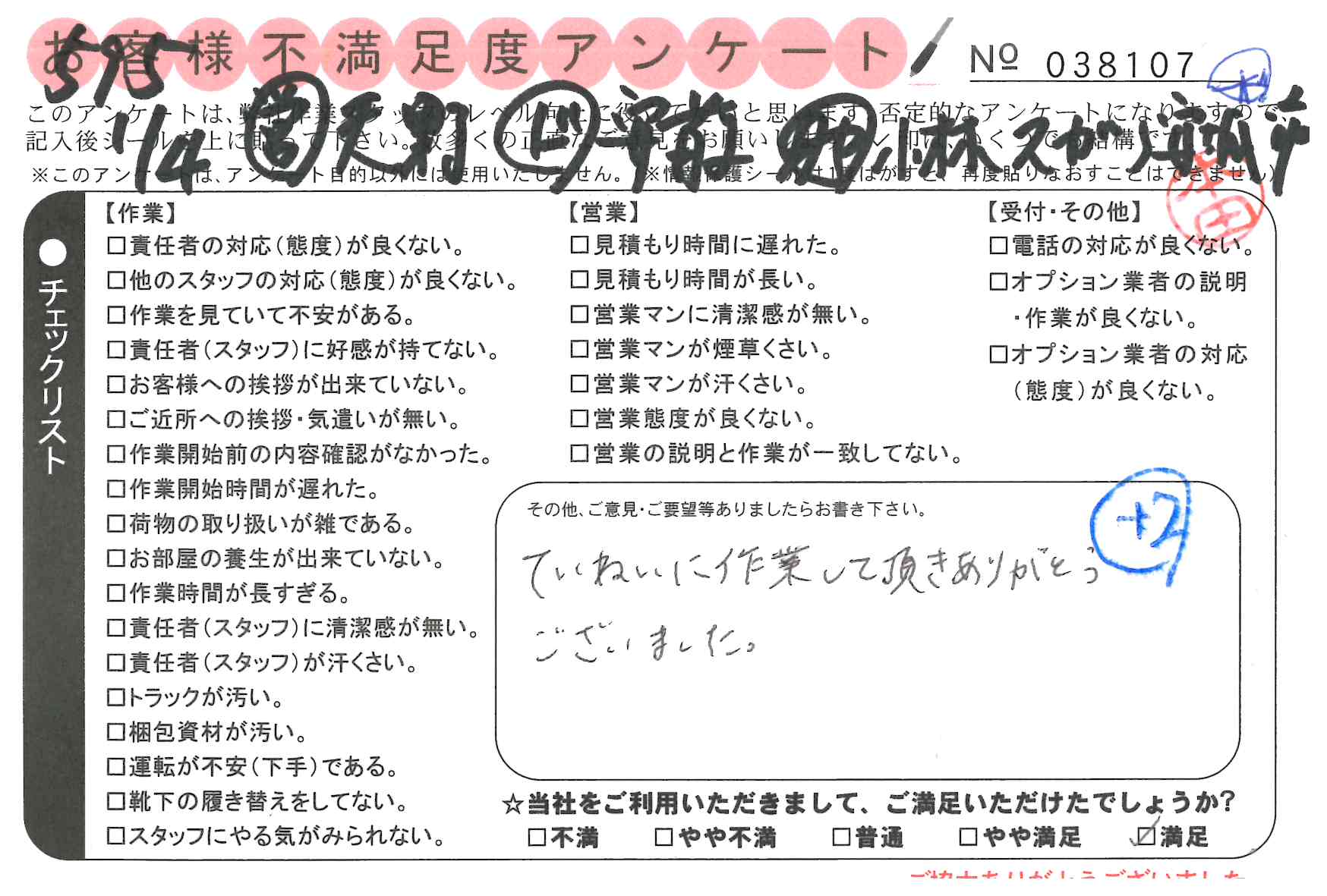 1/4 引越 営業:天野 ドライバー:楠本 スタッフ:楊・佐々木* とても満足しています。ありがとうございました。