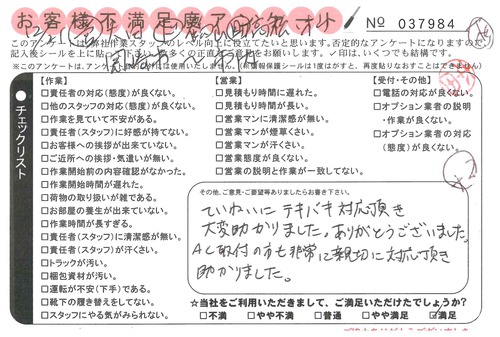 引越一番でお引越しをしていただいたお客様のうち、コメントいただいたアンケートを全て掲載しています。