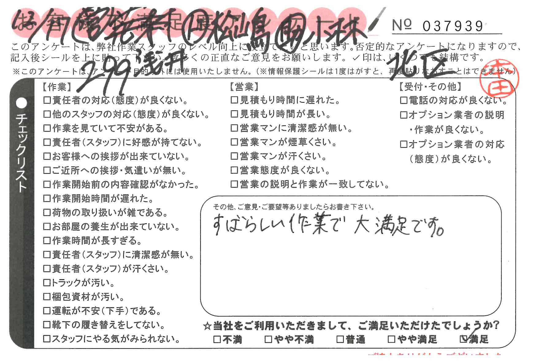 12/17 引越 営業:花村 ドライバー:松嶋 スタッフ:小林* スピーディに作業していただいて助かりました。