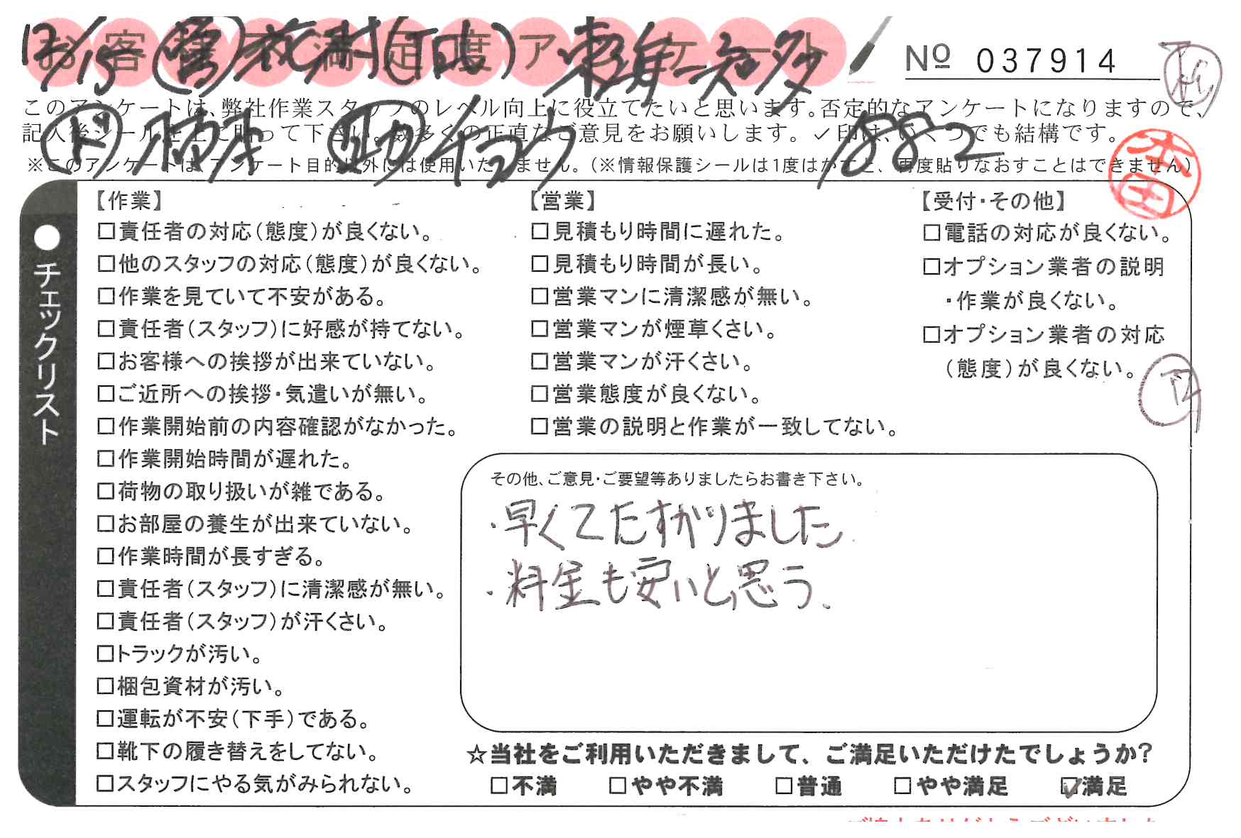 引越一番でお引越しをしていただいたお客様のうち、コメントいただいたアンケートを全て掲載しています。