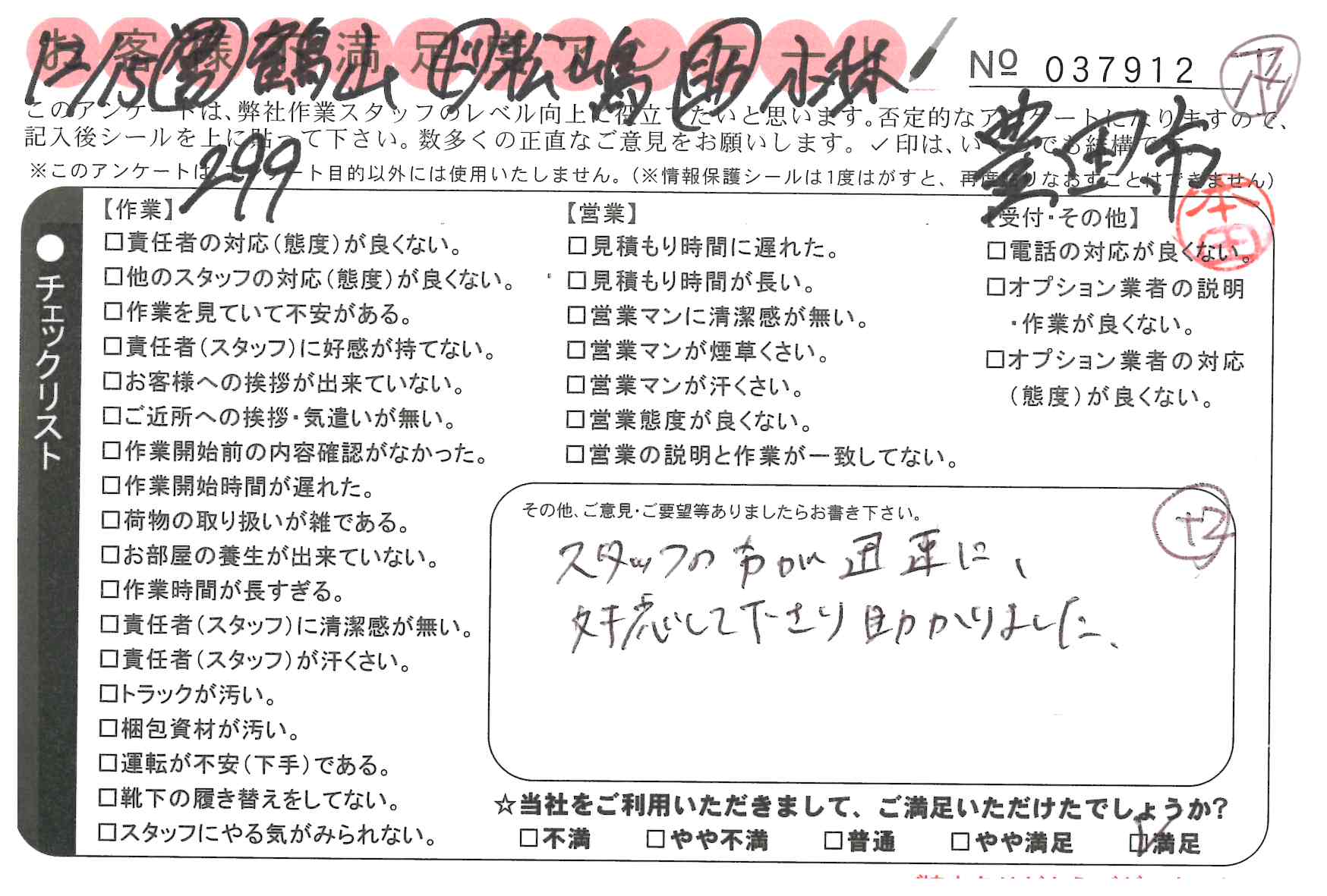 12/13 引越 営業:杉山 ドライバー:三浦 スタッフ:楊* 早い対応をして頂きありがとうございました!