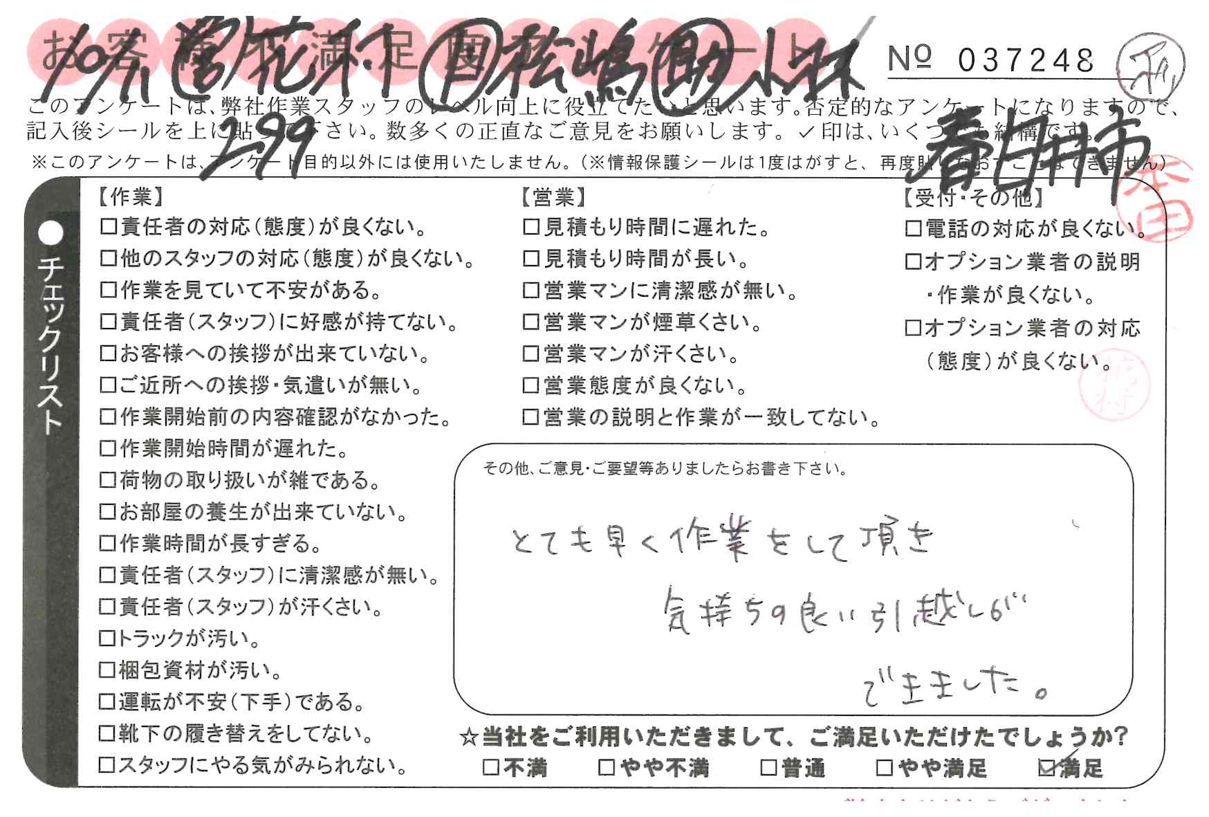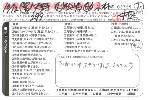 引越一番でお引越しをしていただいたお客様のうち、コメントいただいたアンケートを全て掲載しています。
