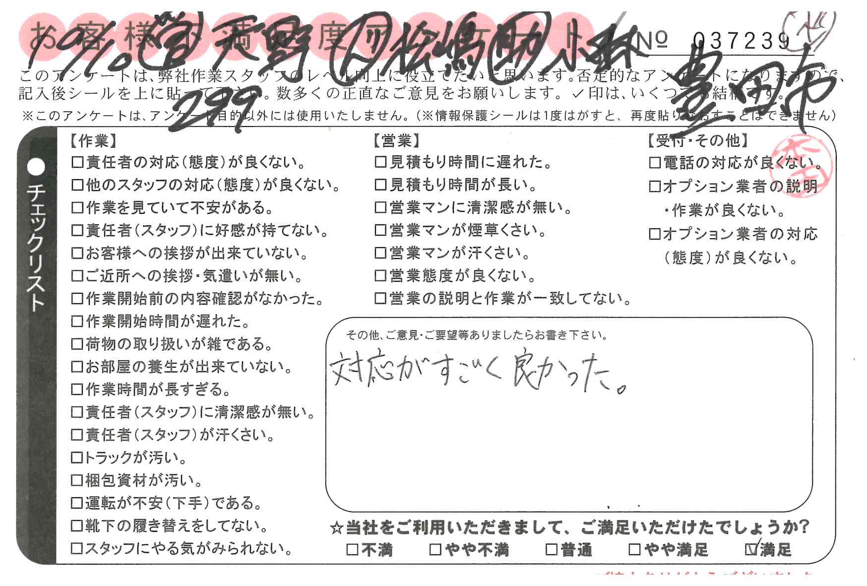 10/10 引越 営業:天野 ドライバー:松嶋 スタッフ:小林* 対応がすごく良かった。