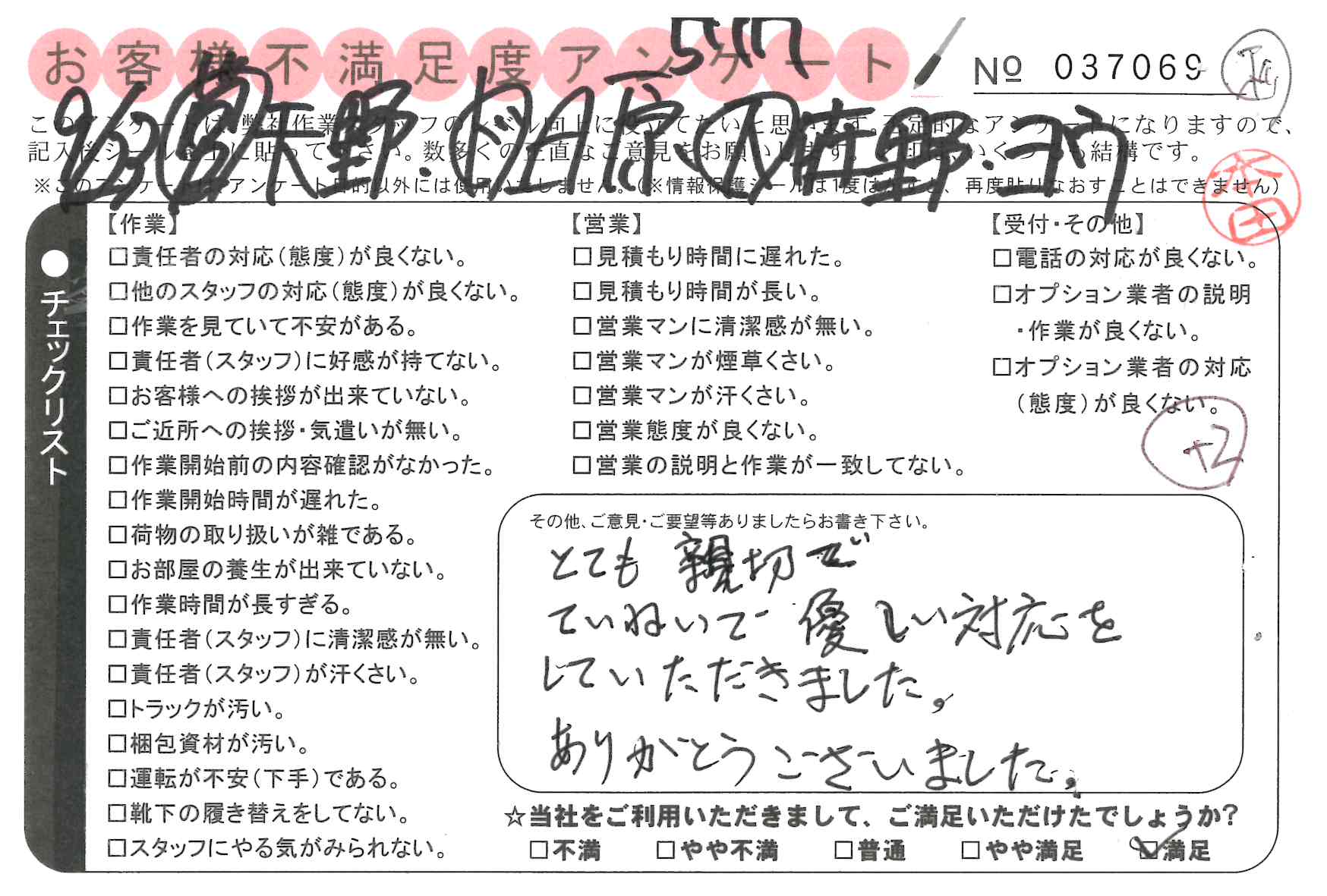 9/23 引越 営業:天野 ドライバー:日原 スタッフ:佐野・楊* とても親切でていねいで優しい対応をしていただきました。