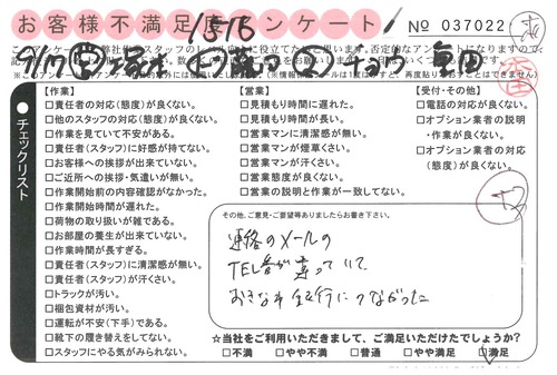 引越一番でお引越しをしていただいたお客様のうち、コメントいただいたアンケートを全て掲載しています。