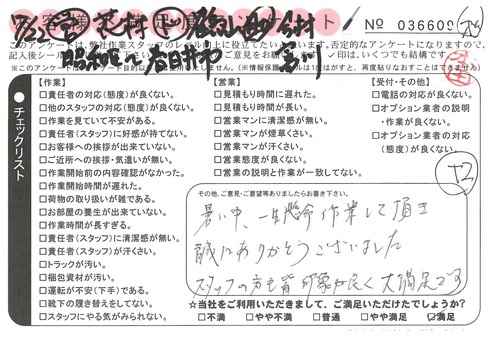7/24 引越 営業:天野 ドライバー:本名 スタッフ:土井・小山* メール対応等は少し簡素に思えたものの、受付や