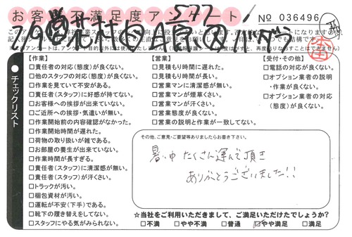 引越一番でお引越しをしていただいたお客様のうち、コメントいただいたアンケートを全て掲載しています。