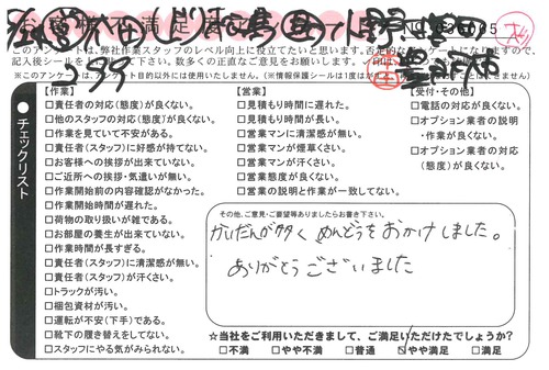 5/25 引越 営業:本田 ドライバー:三浦 スタッフ:長尾* 特に問題ありません。ありがとうございました。