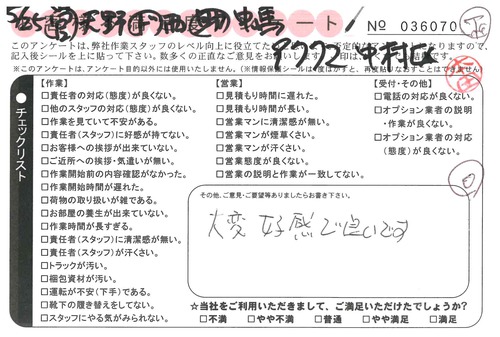 引越一番でお引越しをしていただいたお客様のうち、コメントいただいたアンケートを全て掲載しています。
