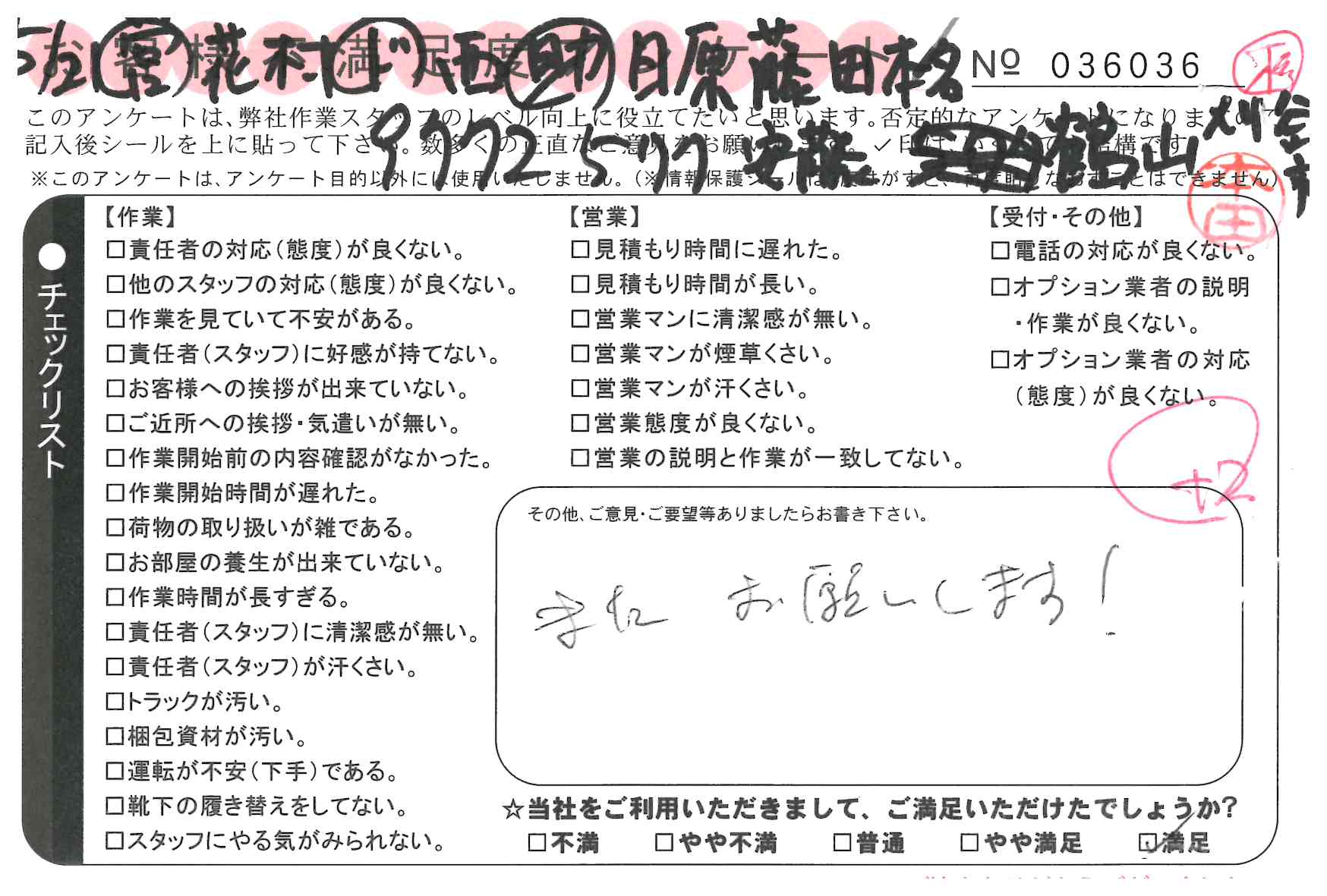 引越一番でお引越しをしていただいたお客様のうち、コメントいただいたアンケートを全て掲載しています。