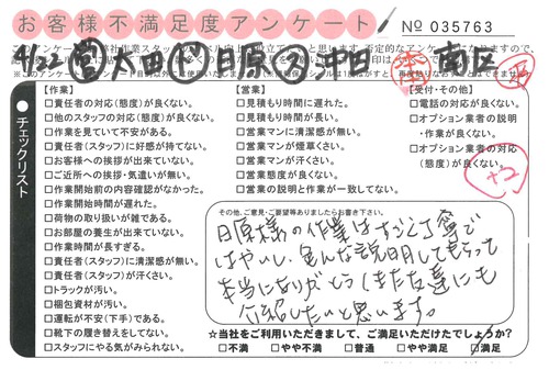 4/21引越 営業:名田 ドライバー:日原 スタッフ:小野 【あま市】とても満足です。ありがとうございました。