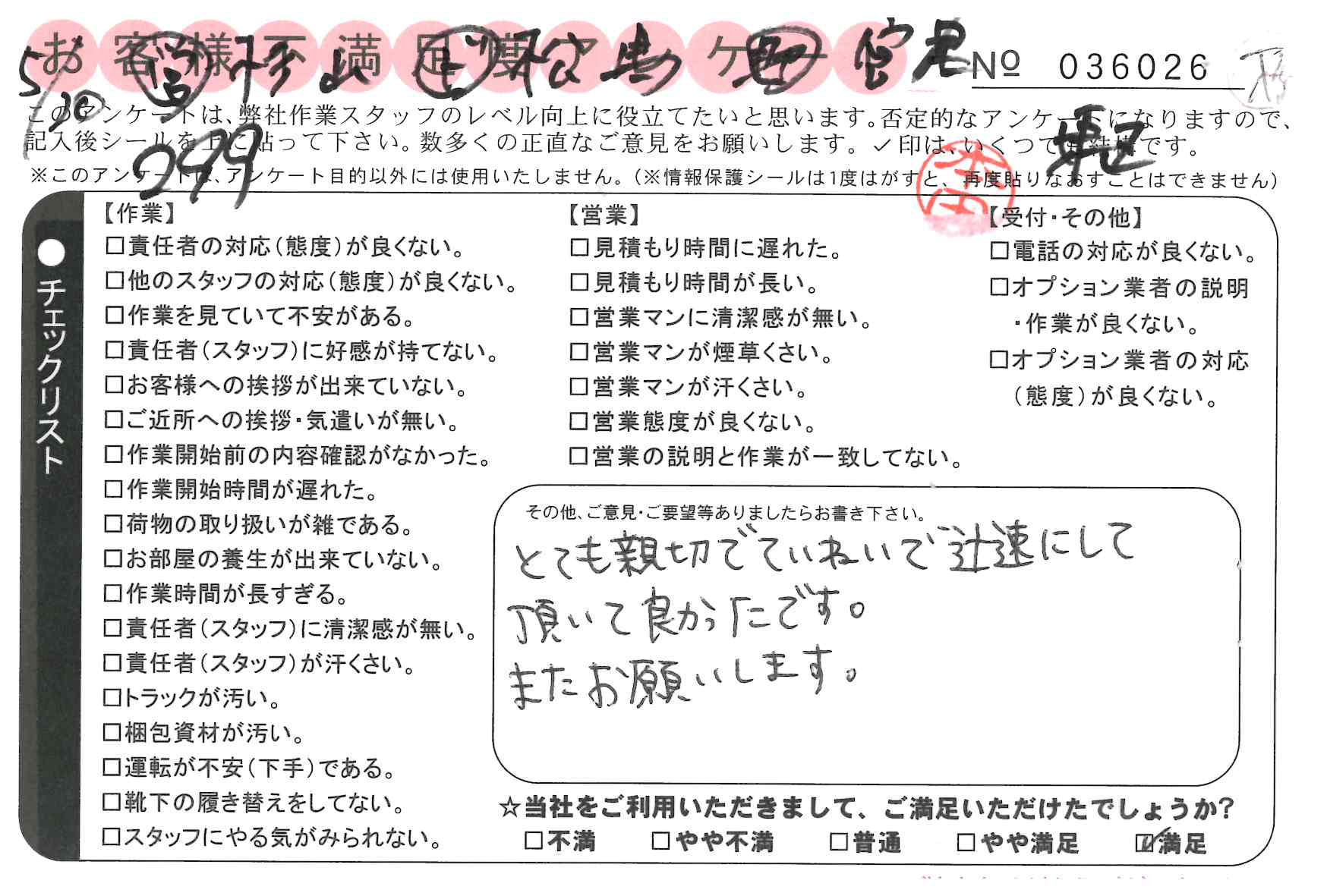 引越一番でお引越しをしていただいたお客様のうち、コメントいただいたアンケートを全て掲載しています。