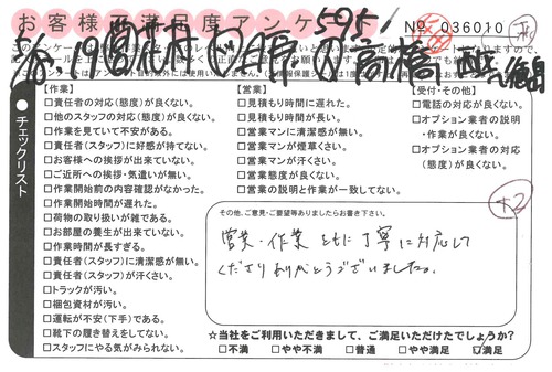 5/19 引越 営業:花村 ドライバー:本名 スタッフ:松﨑* 特に問題なくスムーズに終わりました。