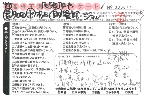 4/15引越 営業:名田 ドライバー:木内 スタッフ:宮里・児島・辺部特に否定的な意見はありません
