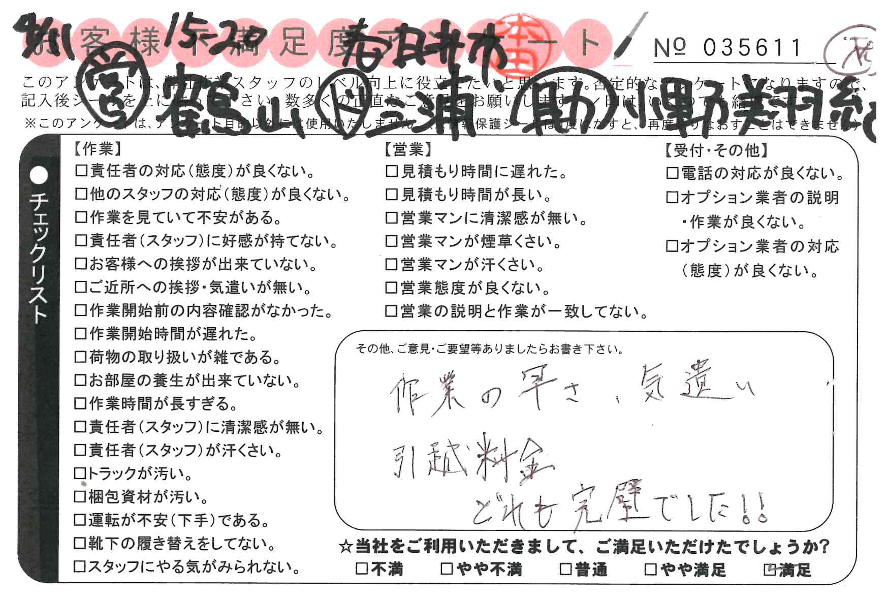 4/11引越 営業:鶴山 ドライバー:三浦 スタッフ:小野作業の早さ、気遣い 引越料金どれも完璧でした‼
