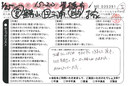 引越一番でお引越しをしていただいたお客様のうち、コメントいただいたアンケートを全て掲載しています。