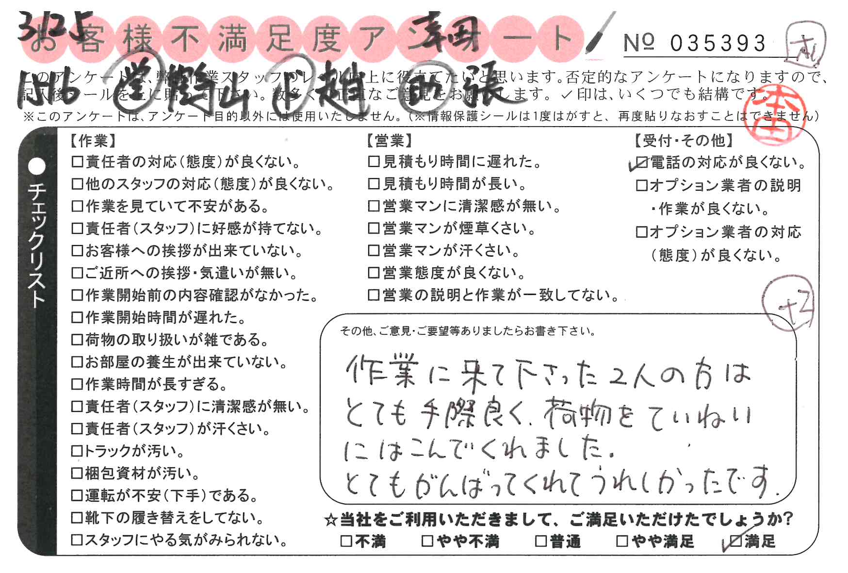 3/25 引越 営業:桝中 ドライバー:趙 スタッフ:張* 速やかに手際良くやって頂き感謝しています。