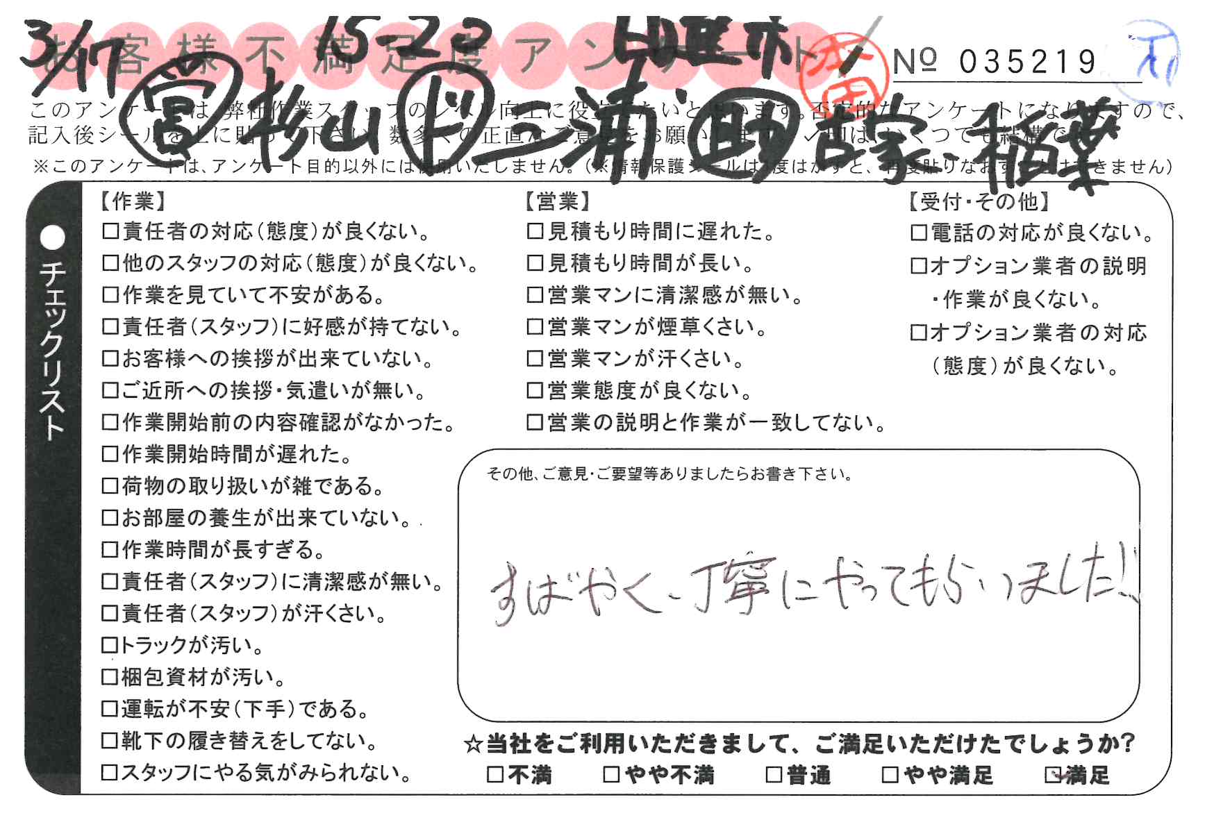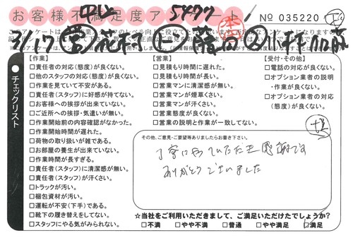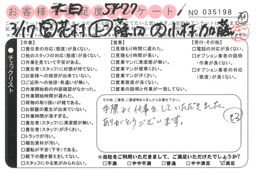 3/17 引越 営業:花村 ドライバー:安藤 スタッフ:小野* 大変手際良くやって頂き助かりました。