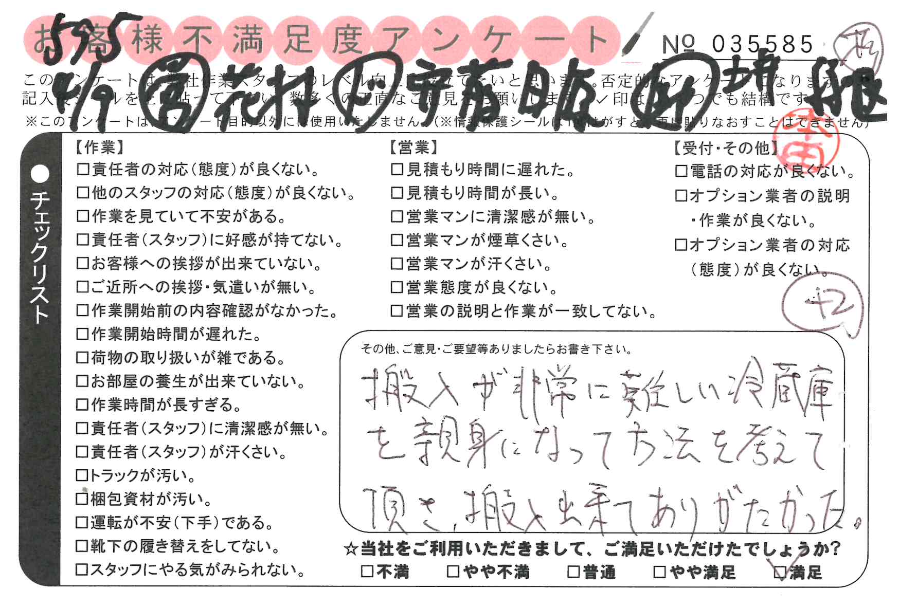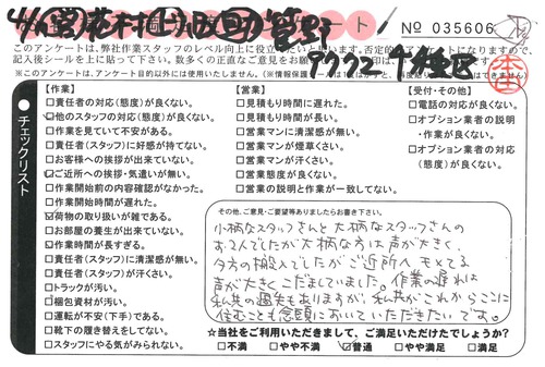 引越一番でお引越しをしていただいたお客様のうち、コメントいただいたアンケートを全て掲載しています。
