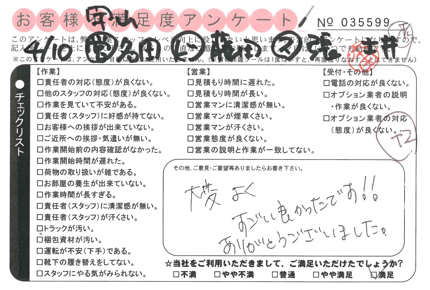 4/10引越 営業:名田 ドライバー:藤田 スタッフ:張・土井大変よく すごいよかったです!!ありがとうございました。
