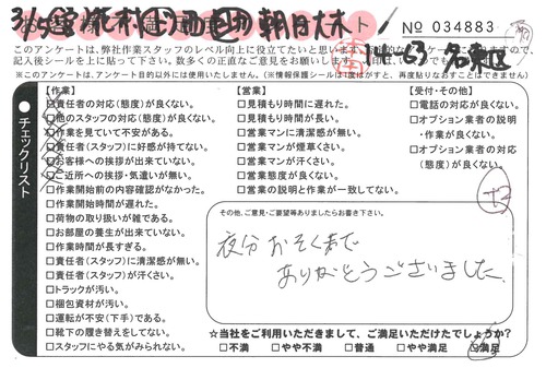 3/5 引越 営業:花村 ドライバー:西 スタッフ:朝日・大木* 夜分おそくまでありがとうございました。