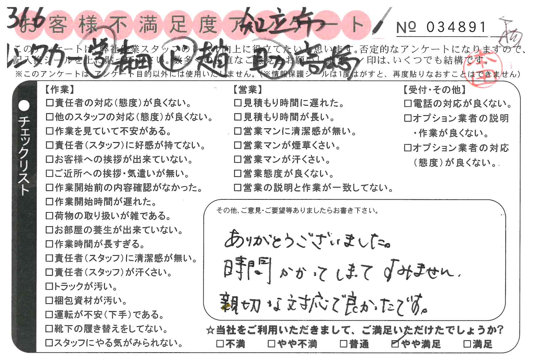 3/4 引越 営業:青木 ドライバー:趙 スタッフ:佐藤・森* 素早い作業でした。ていねいで好感もてました。