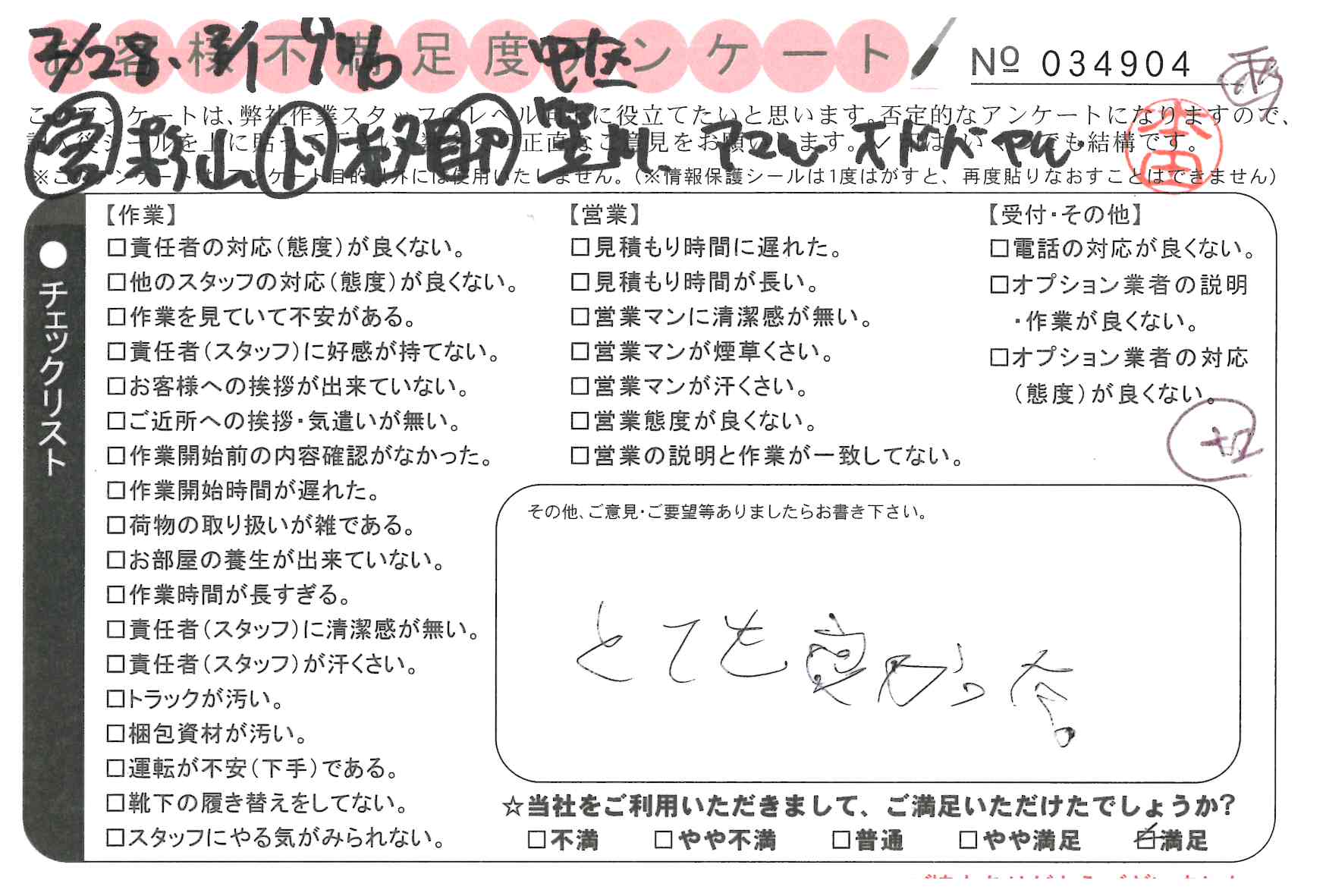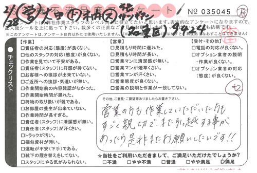 引越一番でお引越しをしていただいたお客様のうち、コメントいただいたアンケートを全て掲載しています。