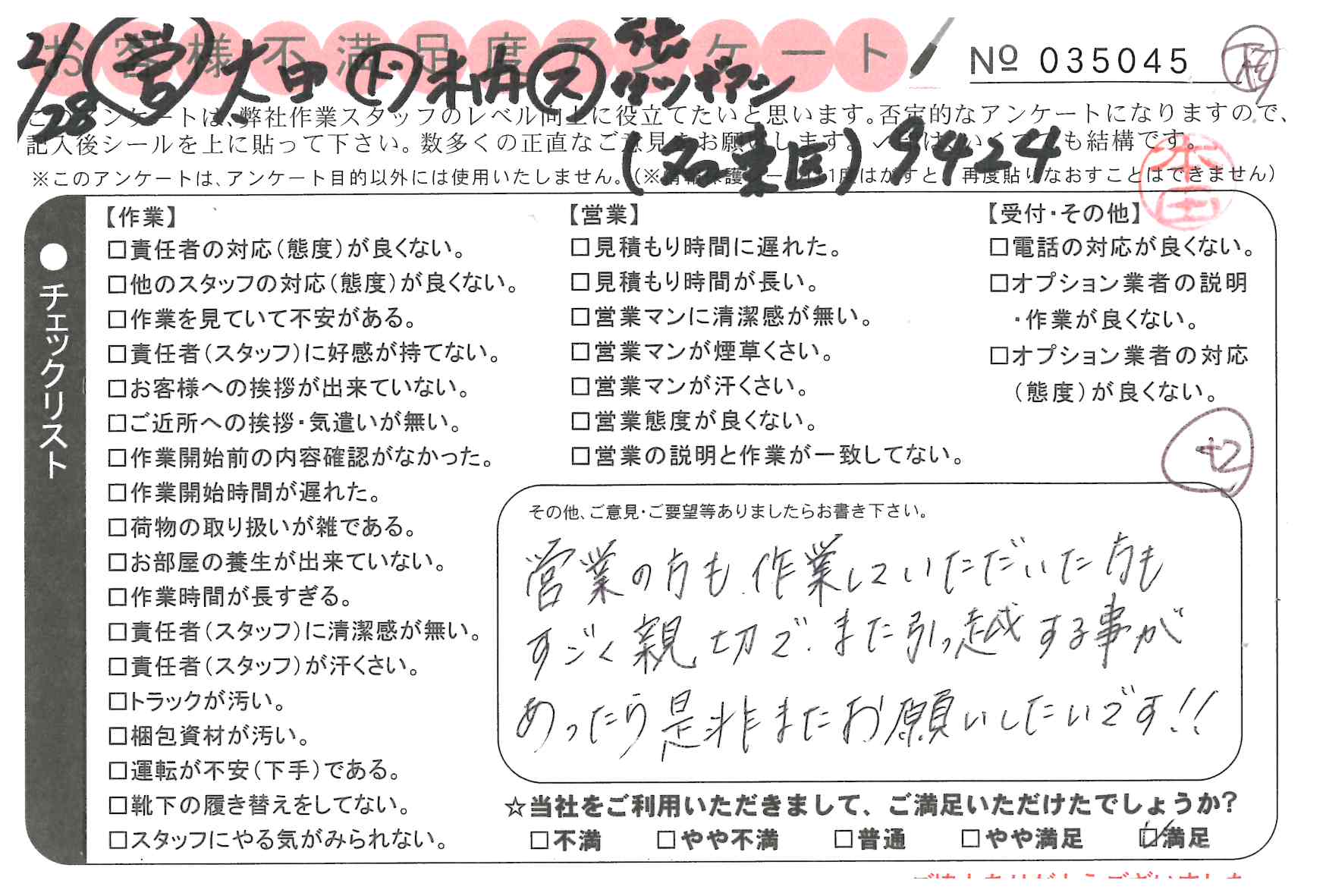 2/28 引越 営業:森田 ドライバー:三浦 スタッフ:小野* 迅速な作業に大変満足しています!