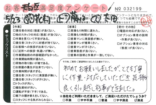 引越一番でお引越しをしていただいたお客様のうち、コメントいただいたアンケートを全て掲載しています。