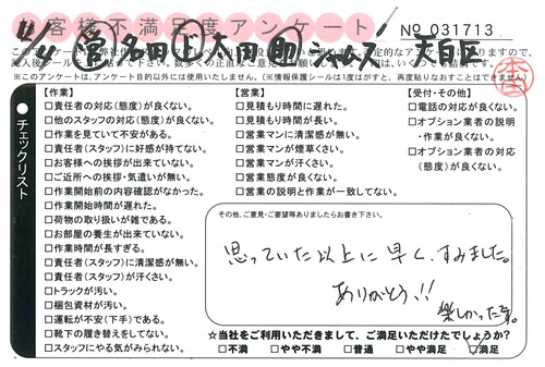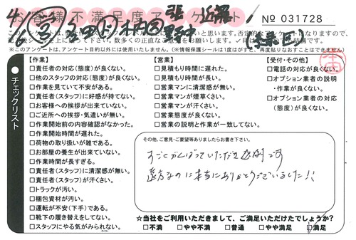 引越一番でお引越しをしていただいたお客様のうち、コメントいただいたアンケートを全て掲載しています。