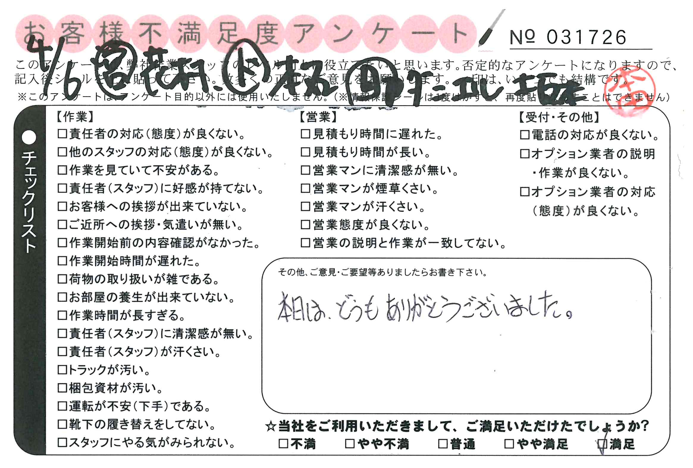 4/3 引越 営業:花村 ドライバー:水漉 スタッフ:シャムス・坂元・脇田・山田* 不満特にありません!!皆さん一生懸命していただいて、
