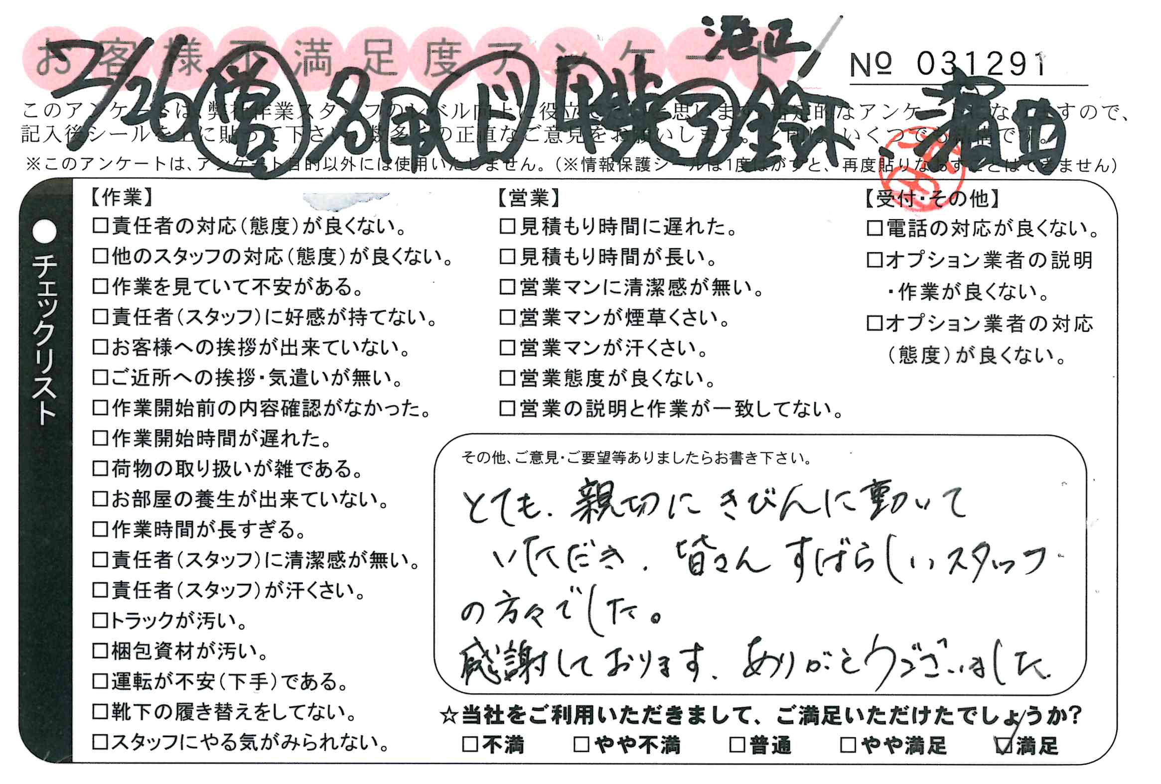 引越一番でお引越しをしていただいたお客様のうち、コメントいただいたアンケートを全て掲載しています。