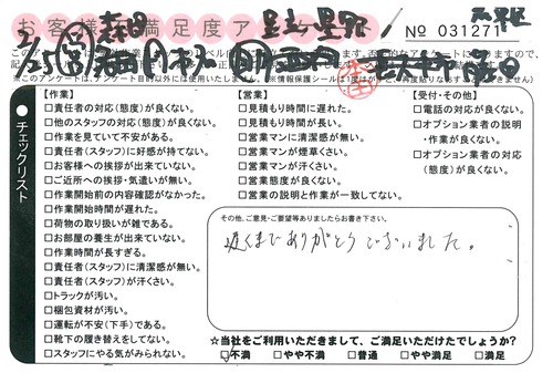 2/25 引越 営業:森田 ドライバー:木村 スタッフ:南* とても対応が良く満足です。
