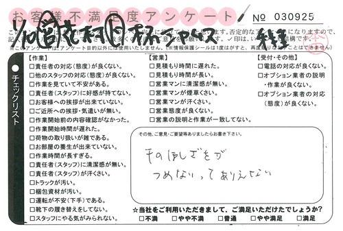 引越一番でお引越しをしていただいたお客様のうち、コメントいただいたアンケートを全て掲載しています。